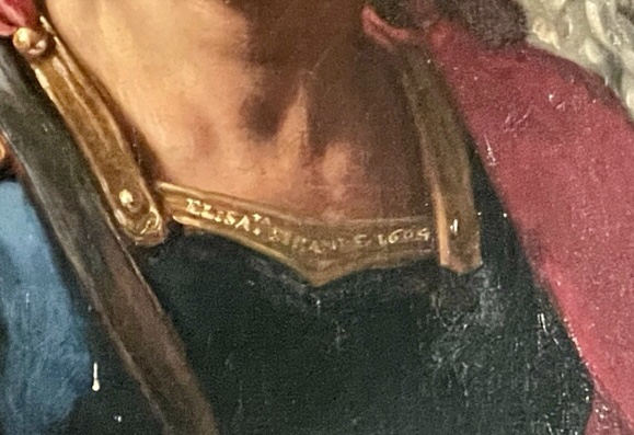 Sirani often signed and dated her paintings. Here on the neck of Alexander’s tunic is inscribed “ELISA.TA SIRANI F. 1664”
