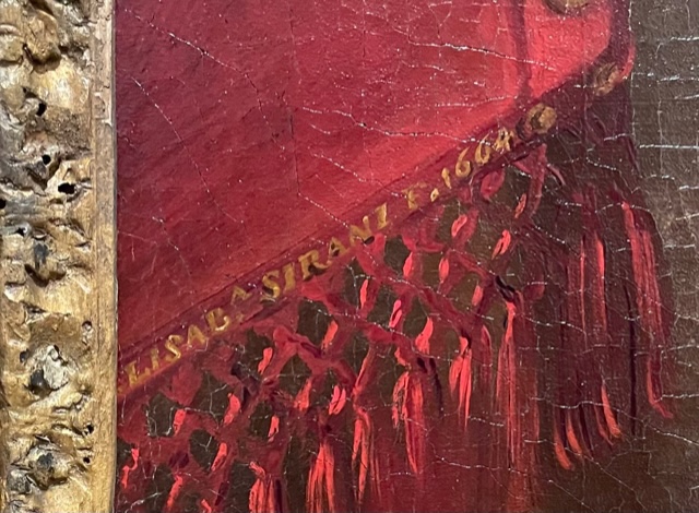 Elisabetta catalogued her work in a diary and unusually for the time signed every painting. Her signature was often hidden in obscure parts of the painting. In this painting, her signature appears on the chair at the left.