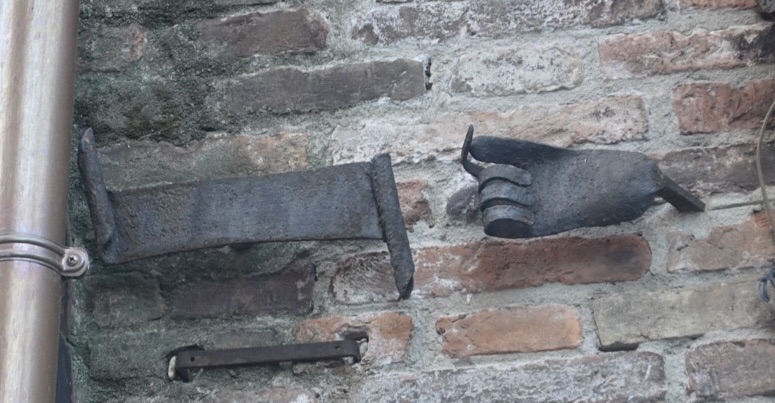 The gates of walled towns such as Bologna were closed at night. It was possible to enter the city via several canals, and these were secured by dropping an iron grill into the canal. One surviving example is located at the end of Via della Grada where the Reno Canal enters the city. For more on the city walls, see my post The Walls of Bologna.