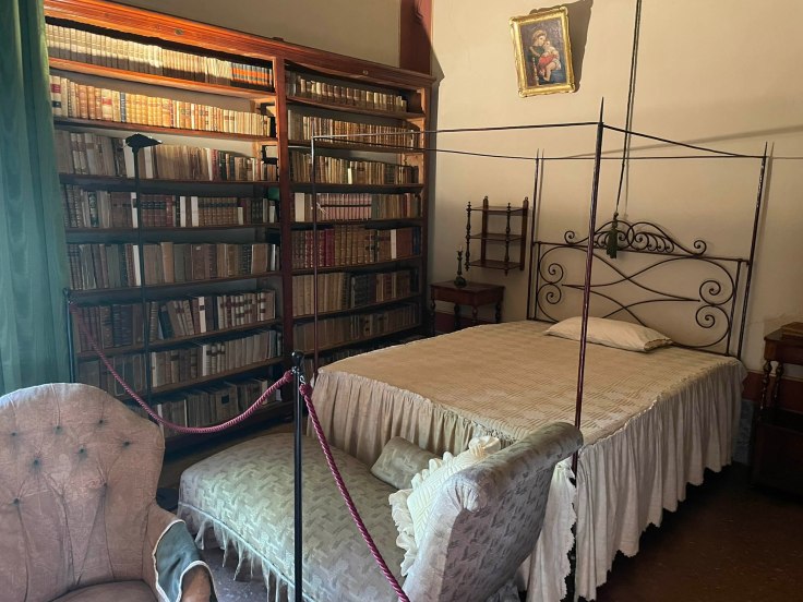 Carducci reached his creative peak in the 1880s. In later years, he became more religious, and his republican ideals weakened. His bedroom, like other rooms unchanged from when he lived in the house, has a copy of Raffaello’s Madonna della Seggiola hanging from the wall.