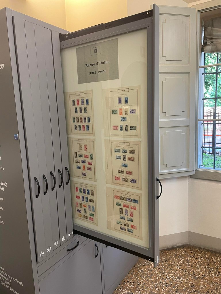 At the rear, there are two cabinets containing the stamp and postal history collection of Professor Giorgio Tabarroni, which was donated to the museum a few years after his death in 2002. The collection includes stamps, postcards, envelopes and letters.